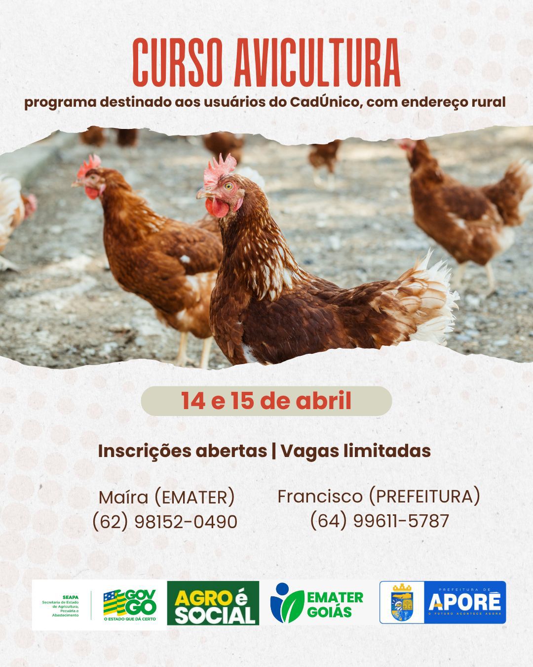 Nos dias 14 e 15 de abril, acontecerá, em Aporé, o Curso de Avicultura, pensado especialmente para usuários do CadÚnico com endereço rural, trazendo conhecimento prático e acessível para fortalecer a produção e melhorar a qualidade de vida no campo.